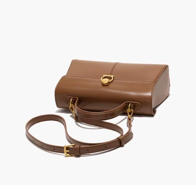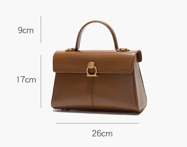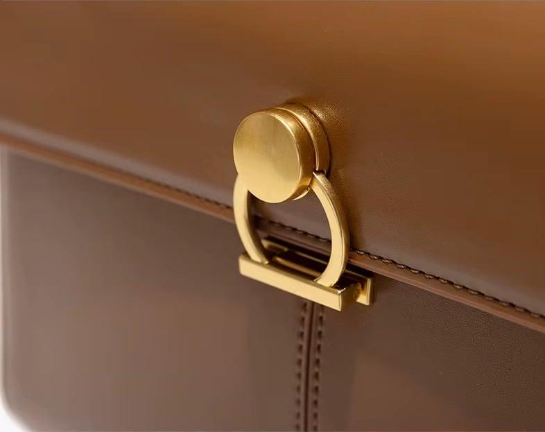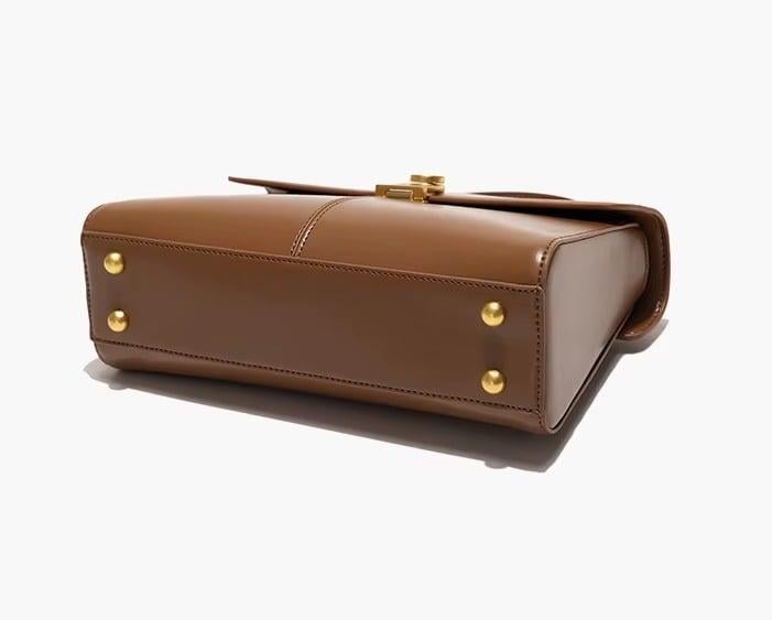 • تفاصيل معدنية ذهبية: جميع الأجزاء المعدنية، من القفل إلى حلقات المقابض، تأتي بلون ذهبي مصقول يتناغم بشكل رائع مع ألوان الحقيبة.
