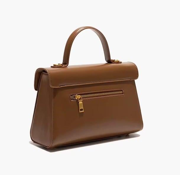 • تصميم فاخر: تتميز الحقيبة بشكلها المستطيل الانسيابي مع حواف ناعمة، وغطاء علوي قابل للطي يغلق بقفل معدني ذهبي اللون بتصميم هندسي مميز وفريد من نوعه يضفي عليها لمسة فنية.